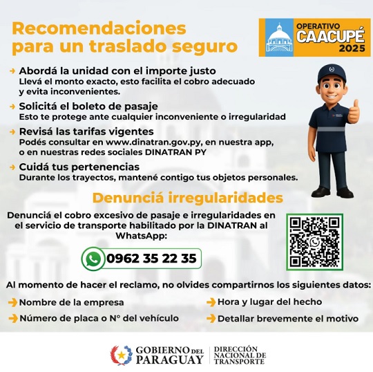 Otra sugerencia: cuidá tus cosas durante el viaje. Mantené tus pertenencias a la vista, tanto en la terminal como en el colectivo. Si tenés algún problema con el pasaje o te quieren cobrar de más, podés escribir al WhatsApp (0962) 352-235.
