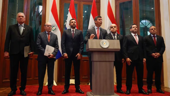 El presidente de Paraguay, Santiago Peña (c), junto al Fiscal General del Estado, Emiliano Rolón (i), el presidente de la Corte Suprema de Justicia, César Diesel (2-i), el vicepresidente de Paraguay, Pedro Alliana (3-i), el presidente del Congreso, Basilio Núñez (3-d), el presidente de la Cámara de Diputados, Raúl Latorre (2-d), y el contralor general de la República, Camilo Benítez (d) Foto Archivo. Juan Pablo Pino