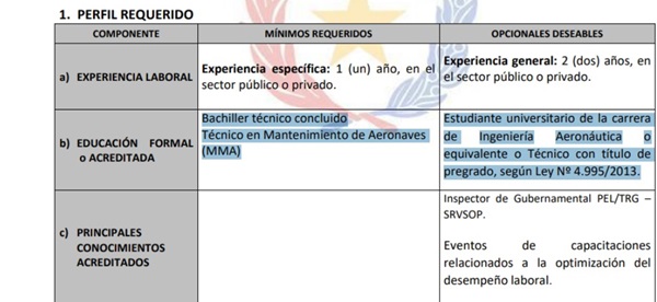 De acuerdo con las denuncias, el cargo debería ser ocupado por un ingeniero o un técnico mecánico aeronáutico con experiencia comprobada. Sin embargo, en la misma convocatoria se observa un cambio significativo. Más abajo, el propio documento habilita la participación de “estudiantes universitarios” o incluso de personas con nivel de bachiller técnico.