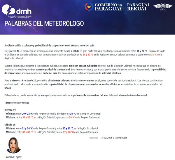 La Dirección de Meteorología e Hidrología prevé para este jueves una jornada con condiciones térmicas variables, que iniciará con un ambiente cálido y derivará en temperaturas elevadas durante la tarde y la noche. El pronóstico señala un amanecer con registros agradables, mientras que el calor irá intensificándose con el avance del día.