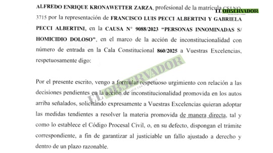 El planteamiento fue realizado por el abogado Enrique Kronawetter, representante legal de Francisco y Gabriela Pecci. El pedido apunta a que la Corte se pronuncie sobre una causa iniciada en abril de este año y que permanece sin resolución.