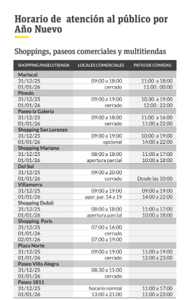 Los shoppings de Asunción y del departamento Central también ajustan sus horarios. Este 31 de diciembre prevén cierres anticipados, mientras que mañana solo funcionarán los patios de comidas.