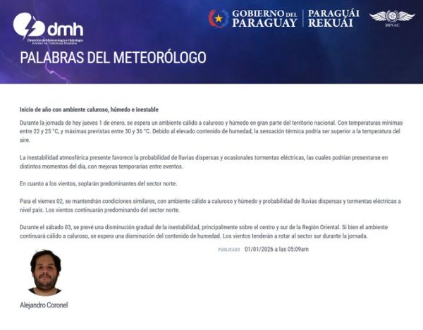 De acuerdo con la Dirección de Meteorología, este jueves 1 de enero presenta un ambiente típico del verano paraguayo. Las temperaturas máximas previstas oscilan entre 30 y 36 °C, mientras que las mínimas se ubican entre 22 y 25 °C durante la madrugada.