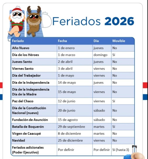 El cierre del año también presenta oportunidades. El feriado de la Virgen de Caacupé será el martes 8 de diciembre y la Navidad caerá viernes 25, lo que permitirá un fin de semana largo.