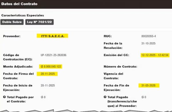 La contratación se concretó a fines de noviembre, durante la gestión del actual ministro Gustavo Villate. Lo que generó especial atención es que itti Saeca fue socia comercial del presidente Santiago Peña en ueno Holding Saeca, y el mismo mandatario ha declarado públicamente tener bonos de esta empresa.