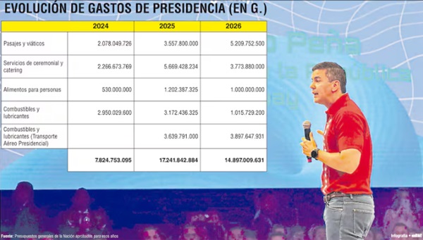 La auditoría de cuatro rubros específicos permite identificar una subida global del 90% en la asignación de recursos. Estas áreas incluyen pasajes, servicios de ceremonial, alimentos y combustibles. En términos nominales, el presupuesto pasó de G. 7.824 millones en 2024 a G. 14.897 millones para el presente ejercicio. Además, esta progresión de gasto se ha mantenido constante durante los primeros años del mandato actual.