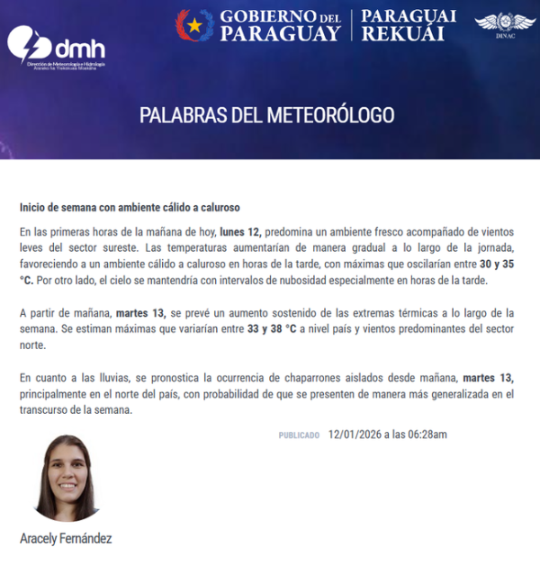 Para el martes, las condiciones seguirían bastante similares: el clima seguiría estable en la mayoría del país, y las lluvias continuarían siendo aisladas, limitándose a zonas del Chaco y del norte de la Región Oriental. Sin embargo, para el miércoles existe la posibilidad de que las precipitaciones se extiendan a más zonas, aunque todavía sin estimaciones claras de cuánto llovería.
