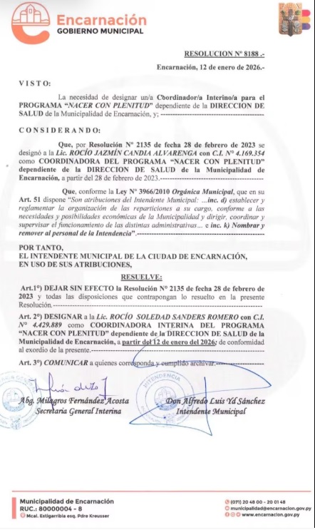 Una resolución firmada por el intendente de Encarnación, Alfredo Luis Yd, dejó sin efecto la designación de Rocío Jazmín Candia Alvarenga como coordinadora del programa municipal “Nacer con Plenitud”. La funcionaria, que además fue pareja sentimental del jefe comunal, había sido nombrada en el cargo en febrero de 2023.