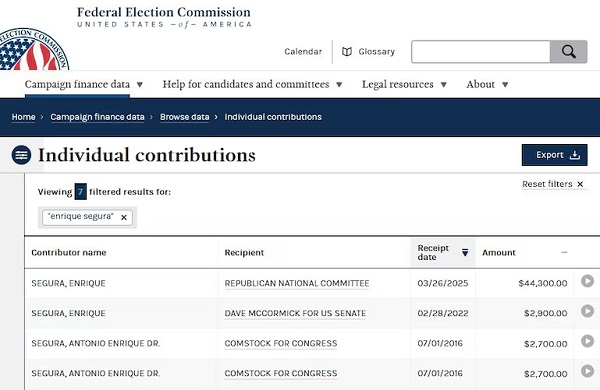 Enrique Segura figura como un donante constante en las campañas republicanas desde el año 2014. Según la Comisión Federal de Elecciones, el empresario aportó recientemente 44.300 dólares al Comité Nacional Republicano. Además, su firma Securiport destinó dos millones de dólares al comité Renew Virginia en 2023. Estos fondos impulsaron la campaña legislativa de su hijo, Juan Pablo Segura.