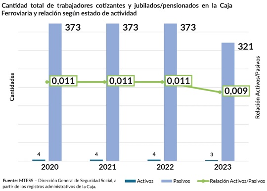 Los registros oficiales del Ministerio de Trabajo, Empleo y Seguridad Social muestran que esta situación no es nueva ni excepcional. Año tras año, la Caja Ferroviaria mantiene entre tres y cuatro trabajadores activos. Al mismo tiempo, sostiene a 321 jubilados y pensionados, una cifra que se mantiene casi sin cambios desde 2023.