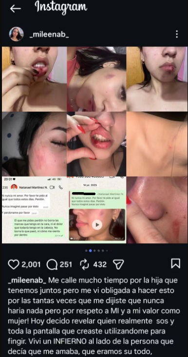 Las imágenes compartidas muestran lesiones que la denunciante atribuye directamente a su expareja. Hasta el momento, Natanael Martínez no emitió una postura pública en relación con las acusaciones.