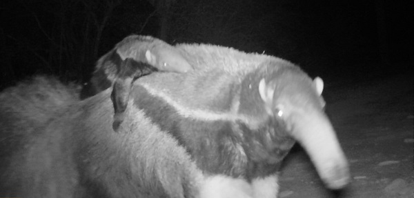 Una cría de oso hormiguero gigante viaja en el lomo de su madre. El momento es capturado por una cámara de fototrampeo. Foto: cortesía Andrea Weiler