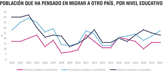 En 2024, el 16% de las personas con educación primaria, el 27% de quienes tienen secundaria y el 23% de los que cuentan con estudios superiores afirman haber pensado en emigrar.