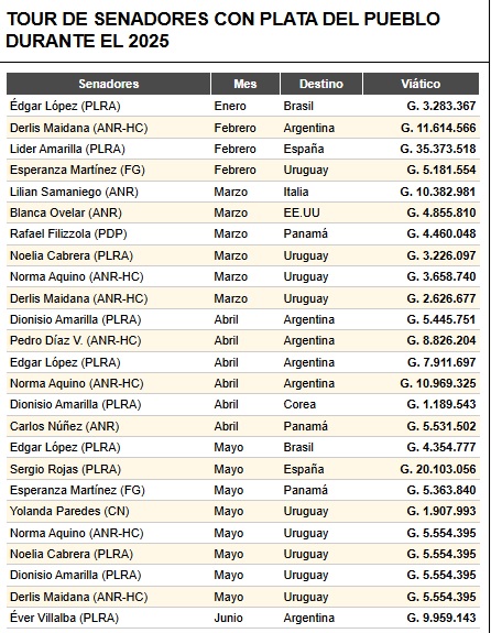 El senador con más viajes registrados fue Dionisio Amarilla, del bloque liberocartista, quien salió del país en ocho ocasiones con destinos que incluyeron Estados Unidos, Corea del Sur, Argentina y Uruguay.