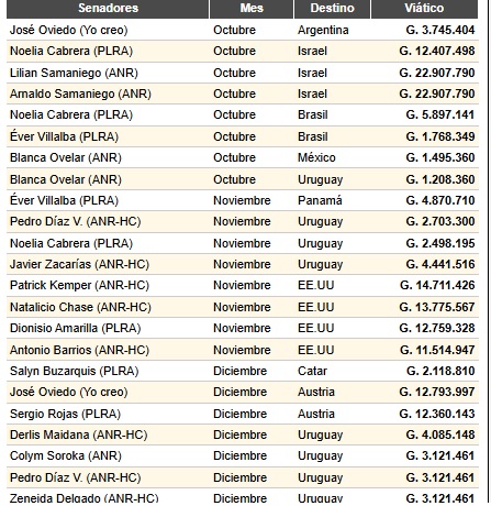 Sin embargo, los mayores desembolsos no corresponden a quienes más viajaron. Los registros señalan que Lilian Samaniego fue quien más fondos recibió, seguida por su hermano, Arnaldo Samaniego. En tercer lugar quedó el senador liberal Líder Amarilla.