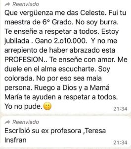 Exmaestra de Celeste Amarilla: «Me das vergüenza, no soy burra, te enseñe a respetar, me duele en el alma escucharte»