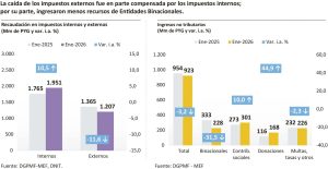 Por otro lado, los impuestos internos crecieron 10,5% interanual en enero. Dentro de ellos, el IVA aportó 5,3 puntos porcentuales al crecimiento. Además, el impuesto a los dividendos y utilidades (IDU) sumó 4,5 puntos. El ISC aportó 1%, mientras el IRE tuvo incidencia negativa de -0,3%.