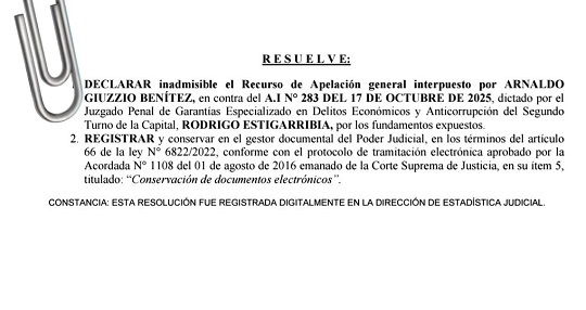 La resolución ratifica el fallo del 17 de octubre dictado por el juez penal de Garantías en Delitos Económicos y Anticorrupción, Rodrigo Estigarribia. En esa oportunidad, el magistrado archivó la causa a pedido del Ministerio Público.