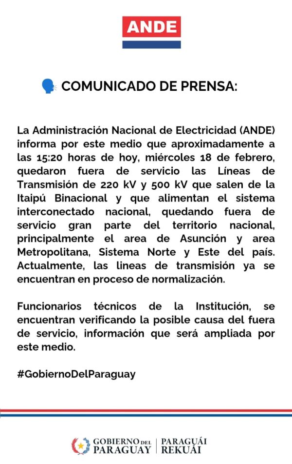La Administración Nacional de Electricidad (ANDE) informó que, aproximadamente a las 15:20 horas de hoy, se produjo la salida de servicio de las Líneas de Transmisión de 220 kV y… pic.twitter.com/dbisy825AV
