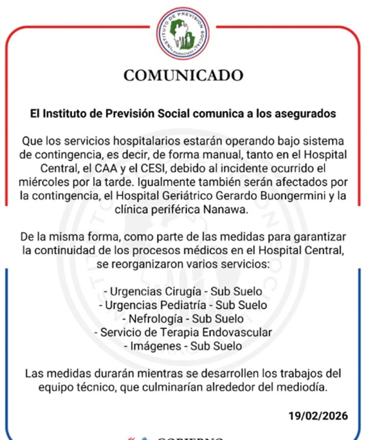 También funcionan bajo contingencia el Hospital Geriátrico “Gerardo Buongermini” y la clínica periférica Nanawa. El IPS advirtió que los asegurados podrían experimentar “demoras debido a los procesos manuales” implementados temporalmente.