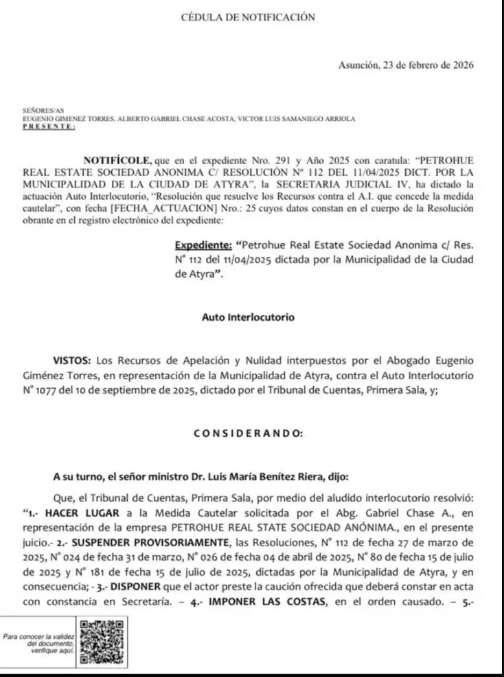 El recurso beneficiaba a la firma Petrohue Real Estate S.A., vinculada al proyecto Highlands Lagoon Lifestyle. La decisión fue celebrada por la comunidad de Atyrá. La resolución hizo lugar a la apelación presentada por el abogado Eugenio Giménez Torres, en representación de la Municipalidad de Atyrá.