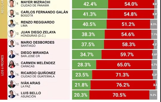 El informe también detalla quiénes encabezan la lista. Carolina Mejía, de Santo Domingo, lidera con 62,8% de imagen positiva. En segundo lugar aparece Clara Brugada, de Ciudad de México, con 59,5%. El tercer puesto corresponde a Ibaneis Rocha, de Brasilia, con 53,8%.