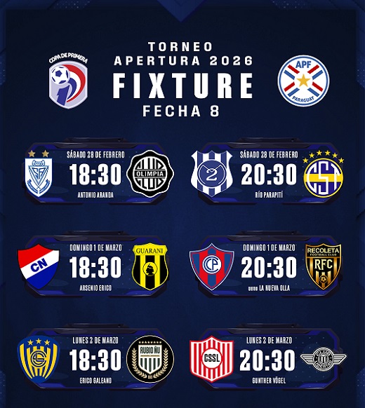La fecha 8 del Torneo Apertura se disputará desde el sábado hasta el lunes. Olimpia llega como líder y buscará sostener esa condición. Cerro Porteño lo sigue de cerca tras su reciente victoria, mientras que Nacional también se mantiene en zona expectante.