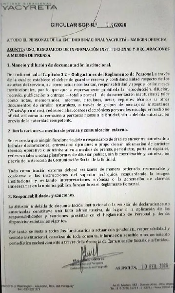 El documento es claro en sus restricciones. La circular impide que cualquier trabajador brinde declaraciones sin autorización previa, instalando efectivamente un estado de vigilancia interna. La normativa no solo bloquea el flujo de datos, sino que amedrenta a los técnicos y administrativos bajo amenaza de sanciones disciplinarias. Por lo tanto, el acceso a la verdad sobre la gestión energética y financiera de la binacional queda ahora supeditado al filtro político de la alta gerencia.