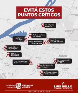 Los lugares identificados por la Municipalidad incluyen varias avenidas de alto tránsito. Entre ellos se encuentran Artigas y Mburicao, General Santos y San Antonio y Perú y Artigas. También figuran Virgen del Carmen y Sargento Marecos y Santa Ana con Roque C. Miranda
