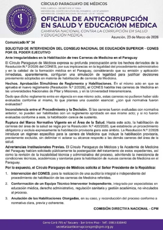 El Círculo Paraguayo de Médicos solicitó la intervención del Consejo Nacional de Educación Superior (Cones). El pedido fue realizado en el marco de su campaña anticorrupción en la salud. La solicitud fue dirigida al Poder Ejecutivo.