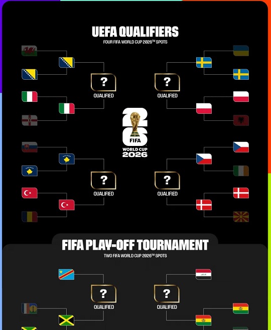 Las finales del repechaje se disputarán el martes 31 de marzo. Los cruces confirmados son República Checa vs. Dinamarca, Bosnia vs. Italia, Kosovo vs. Turquía y Suecia vs. Polonia. También se jugarán Irak vs. Bolivia y Congo vs. Jamaica.
