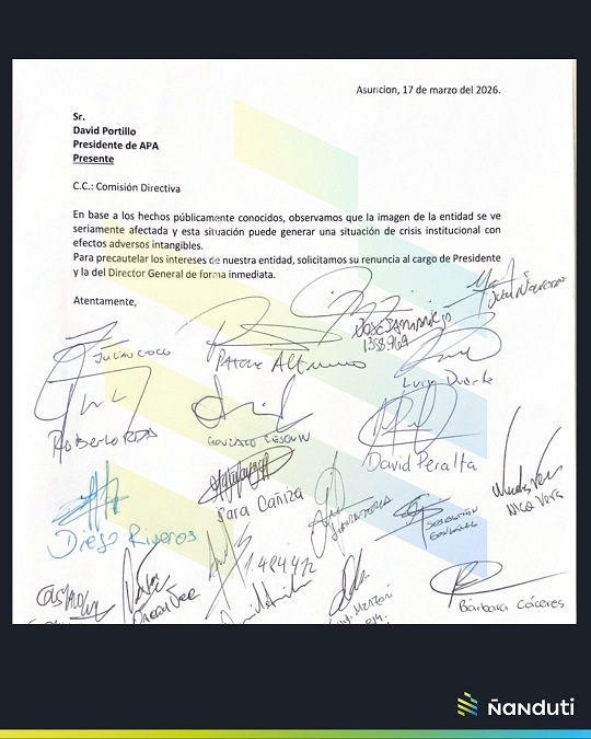 En medio de los cuestionamientos, referentes de la música paraguaya también sentaron postura pública. Figuras como Marilina Bogado, Nadia Portillo, Roberto “Chirola” Ruiz Díaz, Arturo Núñez, David Peralta y Luis Duarte, entre otros, firmaron una nota en la que solicitan la renuncia del presidente de la APA.