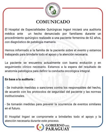 Tras la difusión del caso, el IPS emitió un comunicado oficial. Informó que se inició una auditoría médica para esclarecer lo ocurrido. También indicó que los familiares fueron informados y reciben acompañamiento.