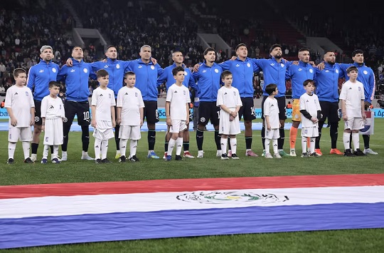 Los jugadores de la selección de Paraguay entonan el himno nacional paraguayo en la previa del partido frente a Grecia en el amistoso internacional Fecha FIFA en el estadio El Pireo, en Atenas, Grecia. Foto: Gentileza - APF.