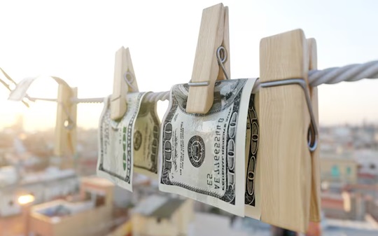Imagen de referecia de lavado de dinero. Billetes extendidos y atajados con pinzas.
