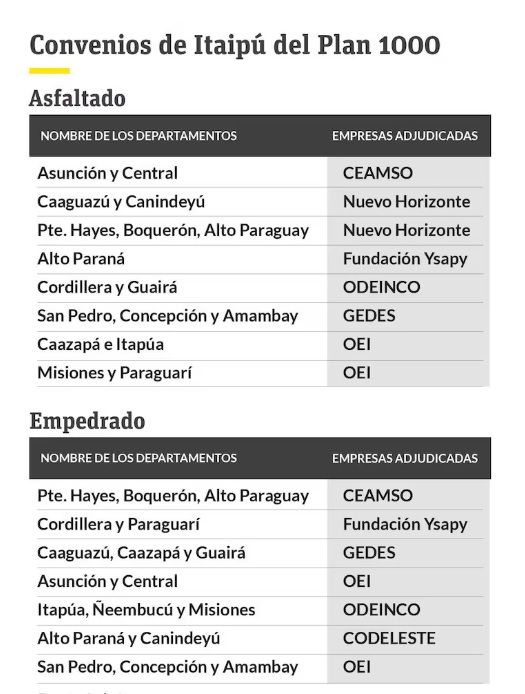 Las obras de asfaltado fueron asignadas a organizaciones como CEAMSO, Nuevo Horizonte y Fundación Ysapy, entre otras. En tanto, los trabajos de empedrado incluyen convenios con GEDES, OEI, ODEINCO y CODELESTE en distintos departamentos.