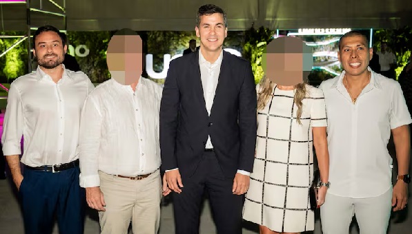 El presidente Santiago Peña (c) junto a Miguel Vázquez (der.) y Juan Gustale (izq.), ambos de Ueno. Gentileza.