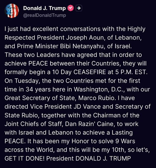 Trump comunicó la decisión a través de su red Truth Social, donde señaló: “Estos dos líderes han acordado que, para lograr la PAZ entre sus países, iniciarán formalmente un alto el fuego de 10 días a las 5 P.M. EST”. Sin embargo, no mencionó el rol del grupo Hezbollah en el proceso.