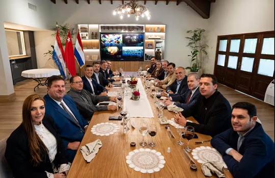 La bancada de Honor Colorado del Senado se reunió con Santiago Peña y Pedro Alliana en Mburuvicha Roga para discutir temas relevantes. Foto: X Pedro Alliana.