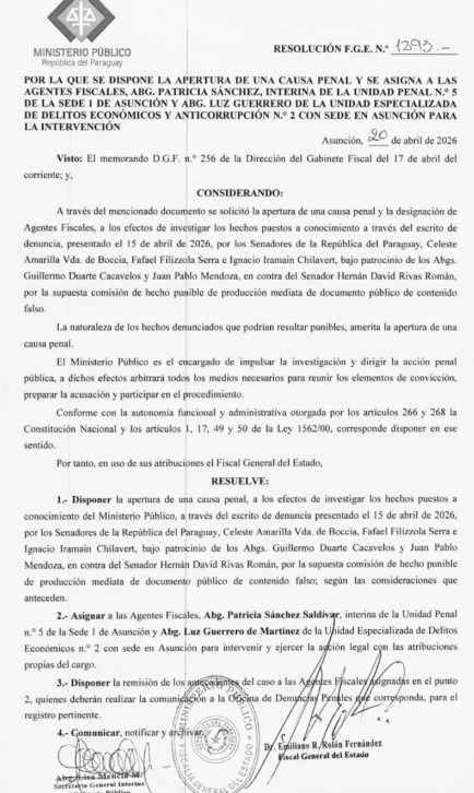 La Fiscalía abrió una causa penal contra Hernán Rivas por presunta producción de documento público falso, tras una denuncia presentada por legisladores de la oposición. La decisión se formalizó mediante una resolución firmada por el fiscal general del Estado, Emiliano Rolón Fernández, el 20 de abril de 2026.