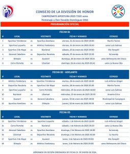 El campeonato Apertura 2025 de la Primera División del fútbol paraguayo ya tiene su programación inicial. El Consejo Profesional de la Divisional de la Asociación Paraguaya de Fútbol (APF) anunció los horarios y escenarios para las primeras tres fechas del torneo, que promete emociones desde el arranque.