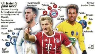 El brasileño Neymar, el belga Eden Hazardy el polaco Robert Lewandowski, serían el objetivo del Real Madrid para montar un nuevo cuadro galáctico.