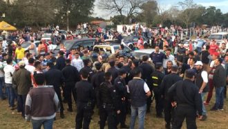La primera final de la Liga Curuguateña de Fútbol culminó con peleas entre aficionados y futbolistas, además de un gran despliegue policial.
