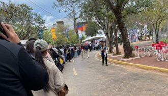 Una extensa fila se formó para el ingreso al polideportivo SND Arena para disfrutar y alentar a Paraguay en la final del baloncesto femenino.