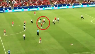 En el partido de Chile contra Uruguay, Gonzalo Jara, le dio un puntapié a un hincha que ingresó a la cancha en pleno partido, vestido de gallina.