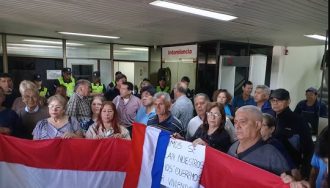 Sin cobrar hace cinco meses, jubilados acampan en la Municipalidad exigiendo a Luis Bello cumplir el pago acordado con la Caja Municipal.