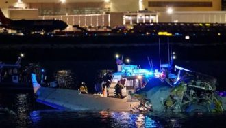 Equipos de rescate trabajan en el río Potomac tras la colisión entre un avión comercial y un helicóptero militar en Washington DC. Se teme que no haya sobrevivientes.