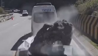 • En Perú, una roca cayó sobre una camioneta en una autopista congestionada, dejando tres muertos y un herido grave. • Investigan causas del accidente.