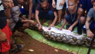 Una mujer, de 54 años, que había desaparecido fue encontrada en el interior de una pitón en Indonesia. Varios hombres abrieron la serpiente y extrajeron el cuerpo sin vida.
