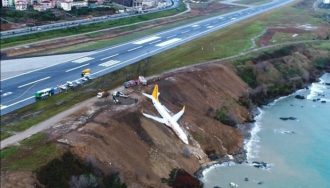 Un Boeing 737-800 de la compañía Pegasus, durante un aterrizaje salió de la pista y se precipitó al mar, quedando varado en un acantilado.